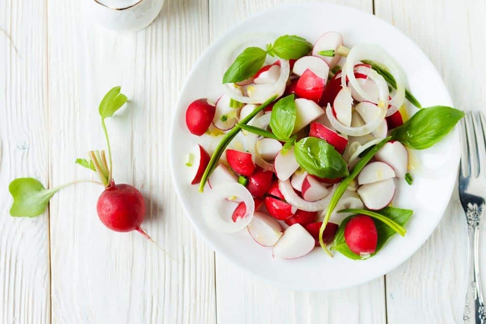 - Wash the radishes properly. Remove the stems and chop the radishes into small sizes. Pour all the ingredients into a bowl and mix to combine.